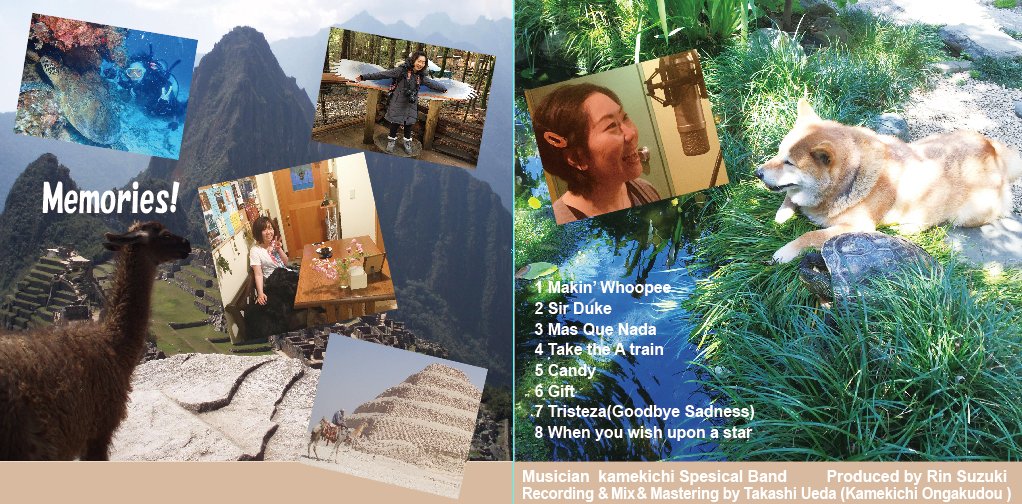 4ページジャケットの中面。旅の写真いっぱいで、迷っちゃった。右はともちゃん家の愛犬チロ。仲良しの亀もいるよ。亀と犬が好き。一緒だぁ!